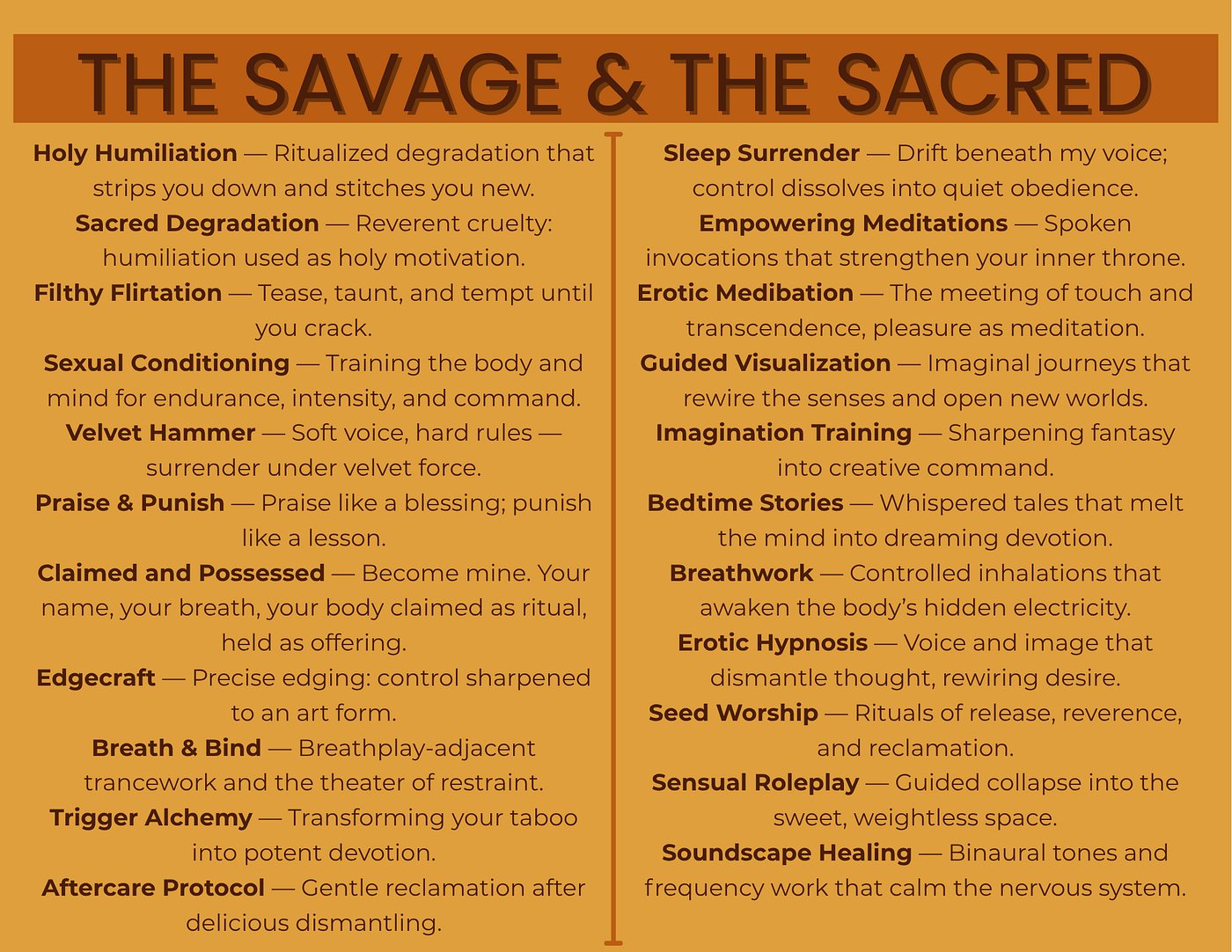 Here you’ll find whispered eros, gentle touch, and tender guidance—alongside cutting degradation, dark humor, and raw, cunning bites of truth.
